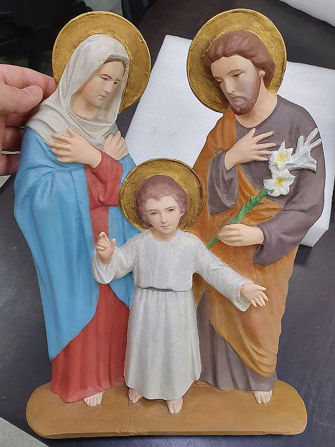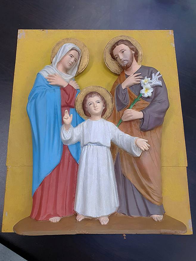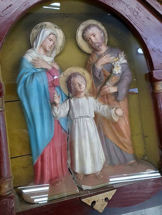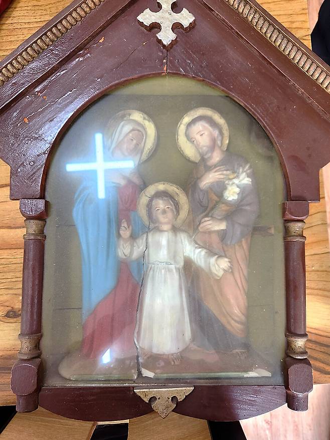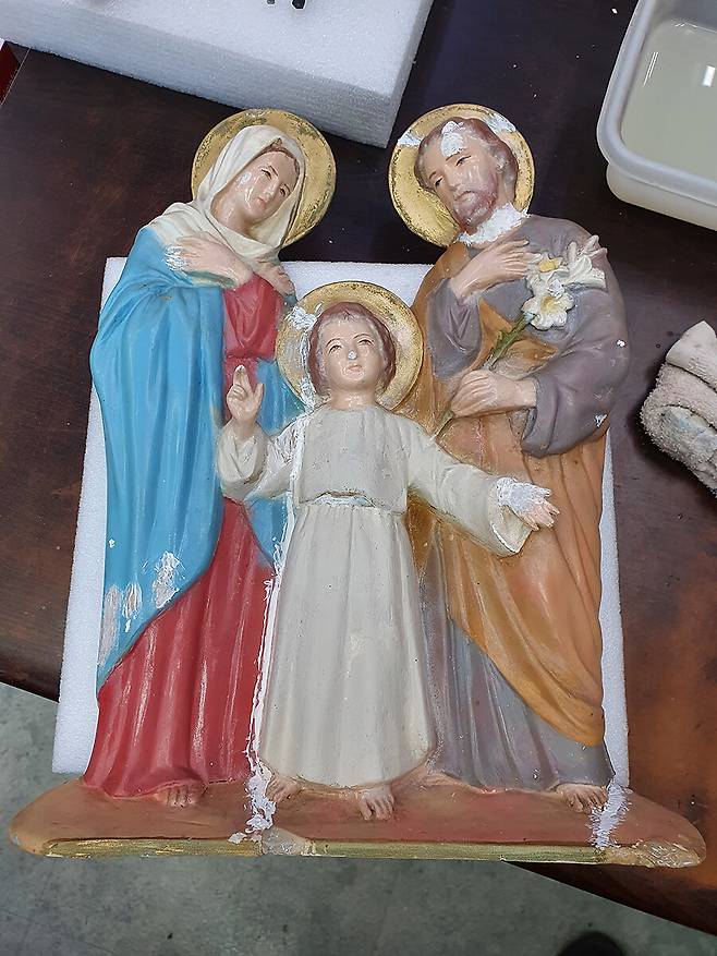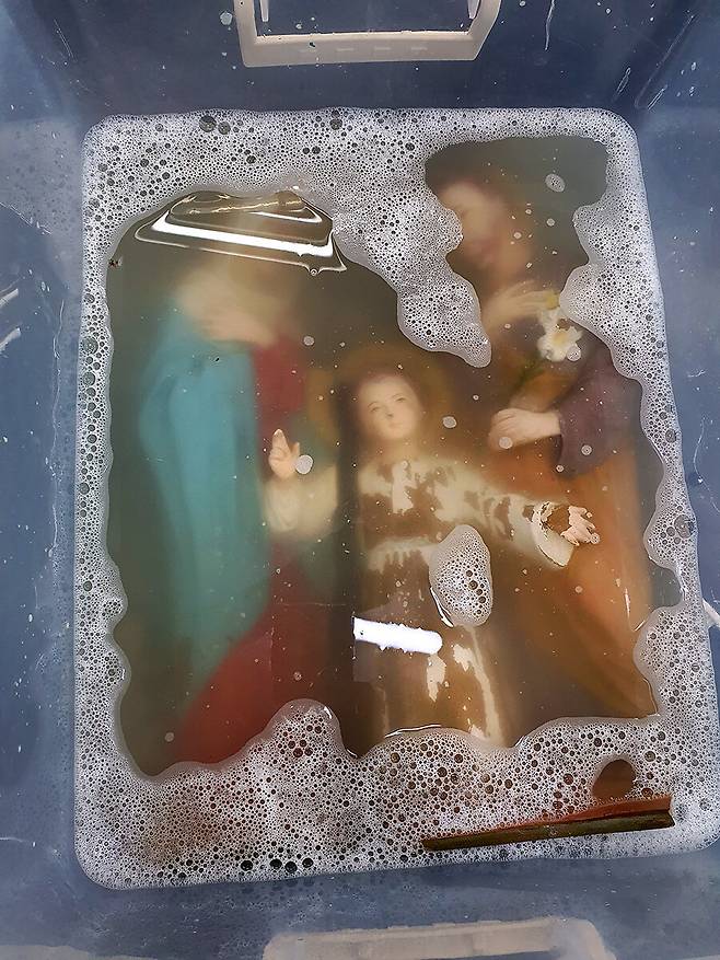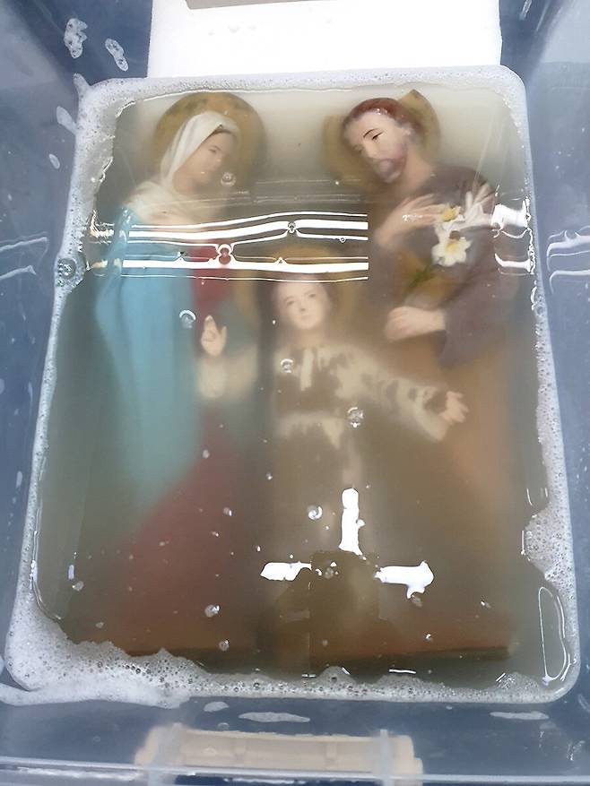 세월의 흔적으로 내려앉은 먼지의 상태가 심각해서 세제 풀은 물에 담가 칫솔로 문질러 닦아 줬는데 가운데의 성자(?)의 하얀 옷의 도막이 그냥 다 떨어져 나갑니다.