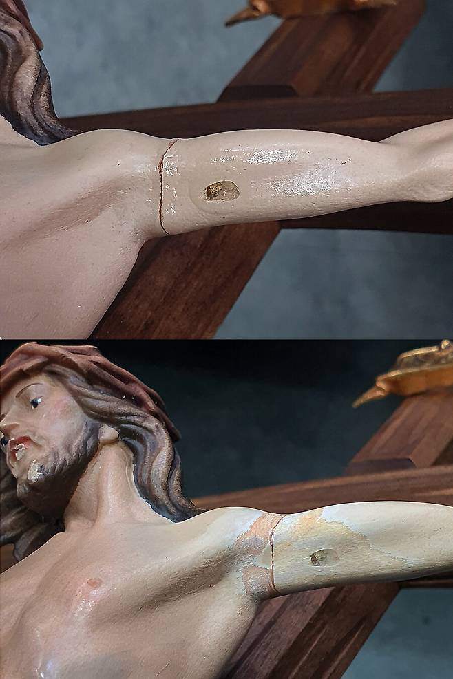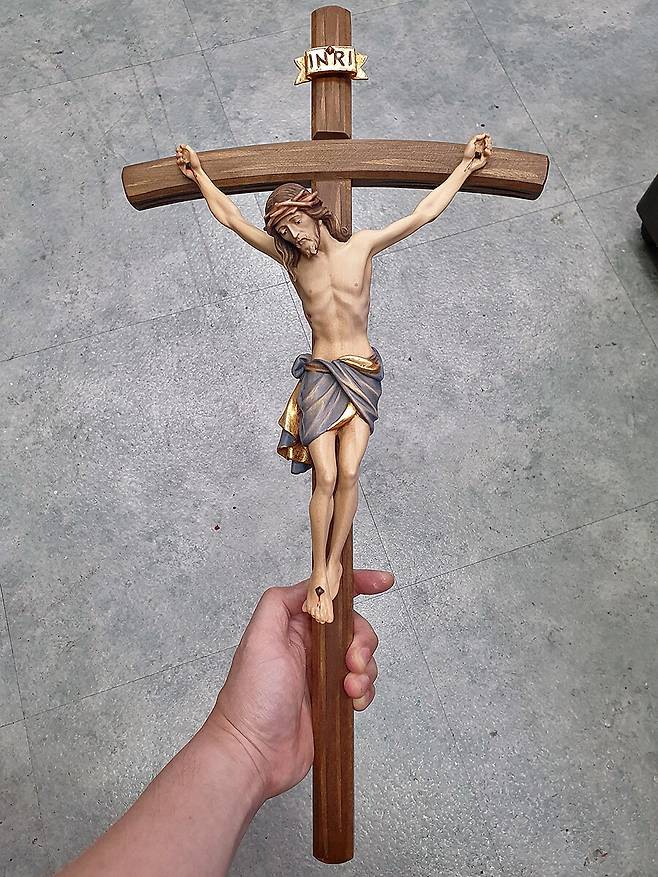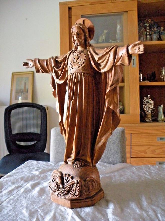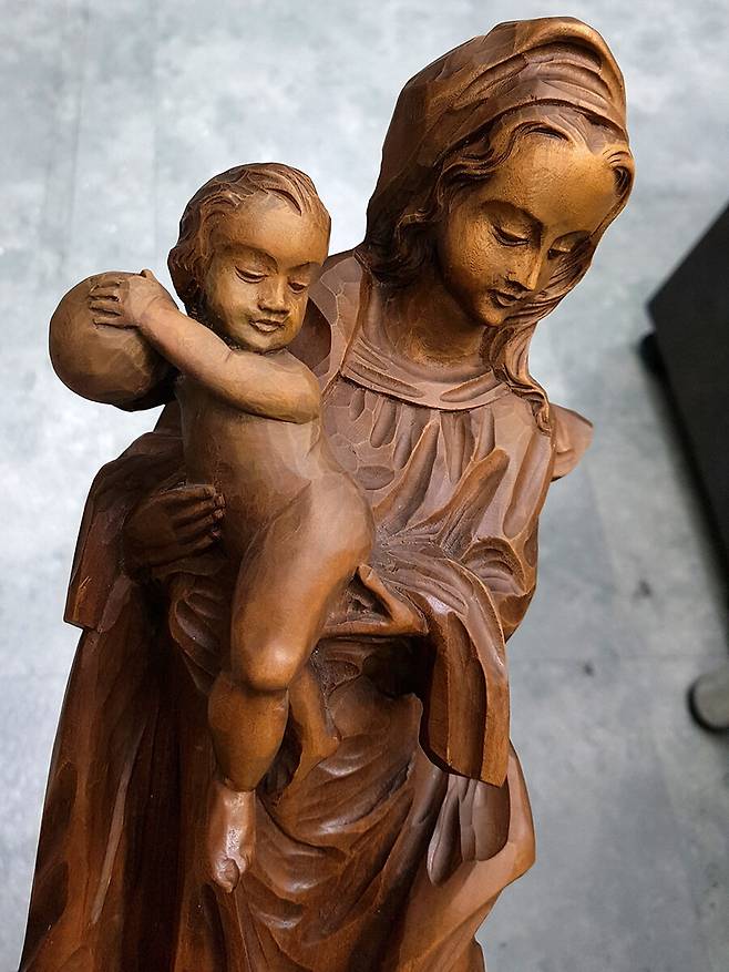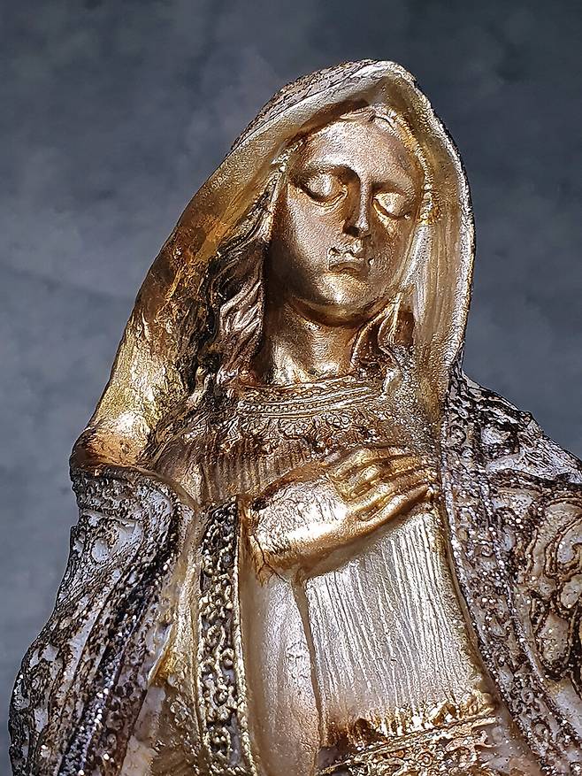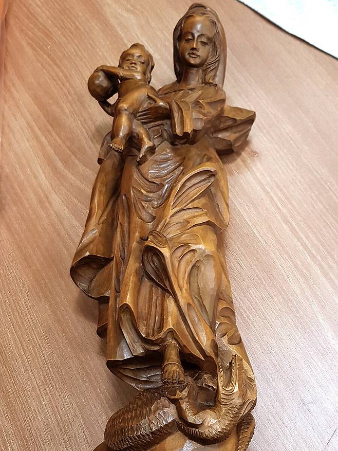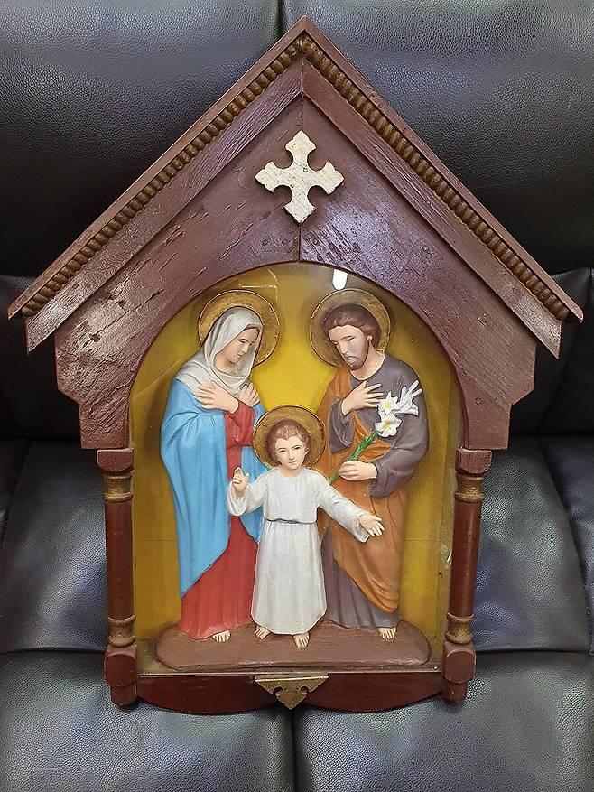 세월의 흔적으로 내려앉은 먼지의 상태가 심각해서 세제 풀은 물에 담가 칫솔로 문질러 닦아 줬는데 가운데의 성자(?)의 하얀 옷의 도막이 그냥 다 떨어져 나갑니다.