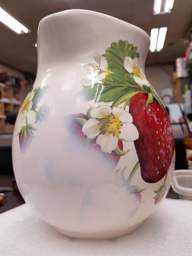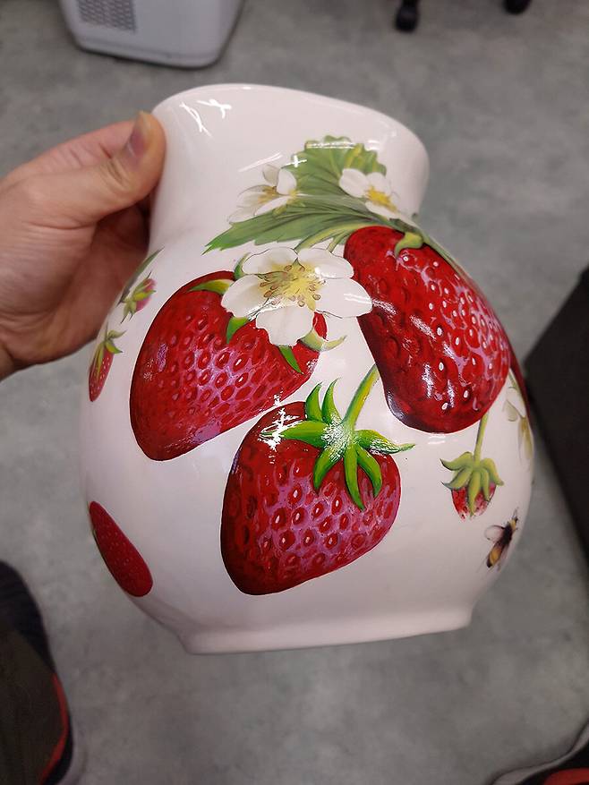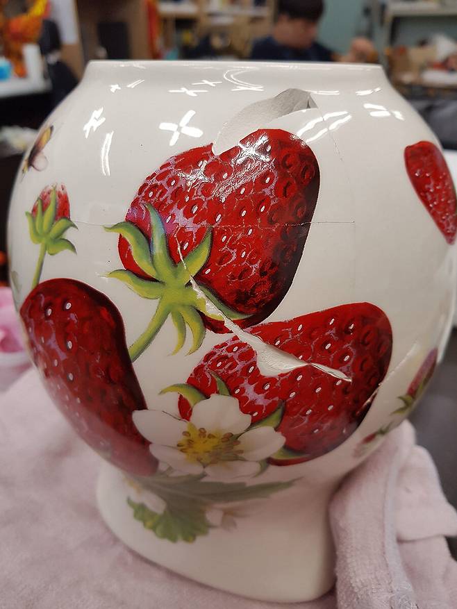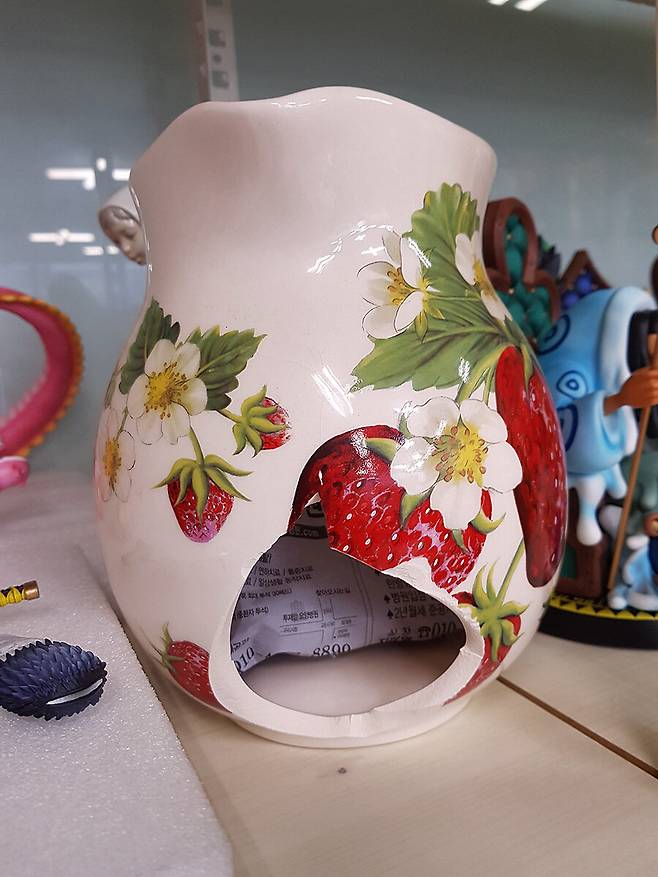 딸기가 그려진 아래 부분이 동그랗게 깨졌습니다.