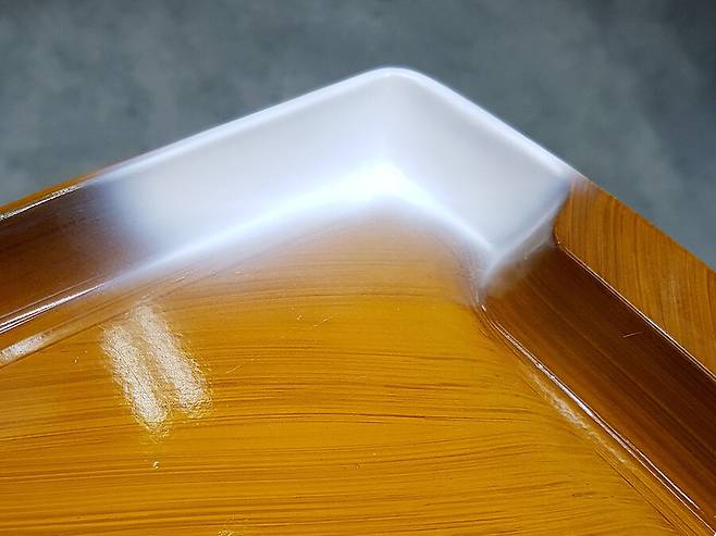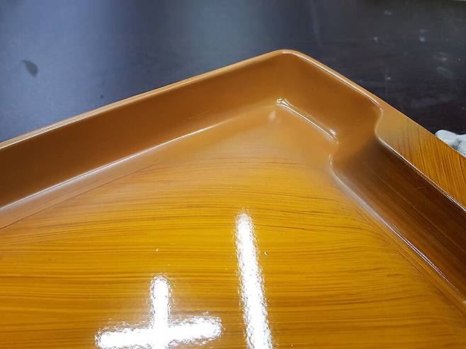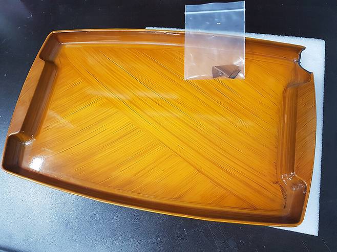 실수로 떨어트려서 플라스틱 쟁반 귀퉁이가 깨졌다 합니다.