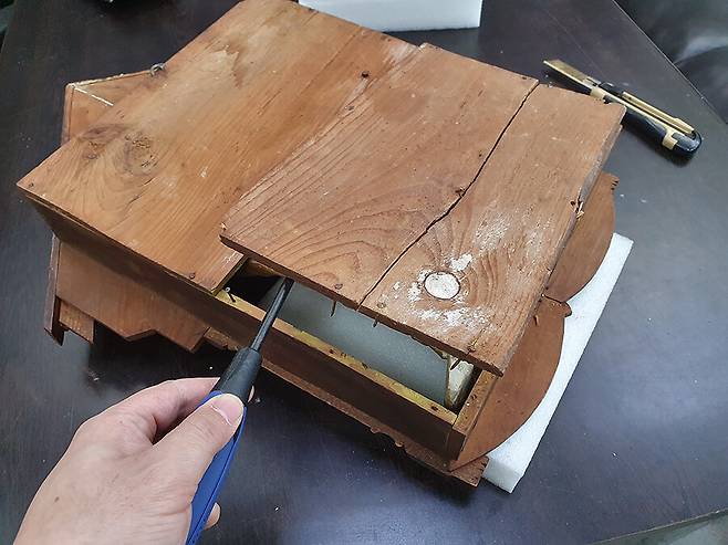 기존의 뒤판은 너무 낡아서 버리고 적당한 나무 판을 구해서 비슷한 색을 칠해 줍니다.