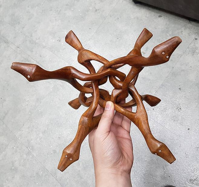 뱀 네 마리를 형상해서 조각한 걸로 보입니다. 위에 뭔가를 올려두는 받침대 같아요