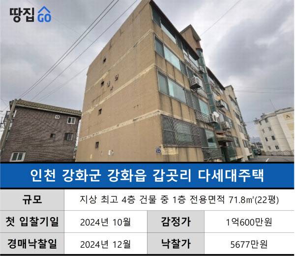 땅집고옥션(☞바로가기)에 따르면, 해당 물건은 강화군 강화읍 갑곳리 M빌라 1층으로 전용면적 71.8㎡(약 22평)이다. 최초 감정가는 1억600만원으로 2023년 11월 감정평가 당시 인근 빌라 실거래금액인 1억700만원과 비슷했다.