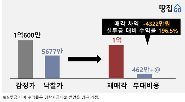 2024년 10월 첫 입찰을 진행했지만, 2차례 유찰돼 같은 해 12월 3회차 입찰이 진행됐다. 이때 단독으로 입찰에 참여한 A씨는 감정가보다 46% 정도 낮은 5677만원을 써내 낙찰받는 데 성공했다. 최저입찰가격(5194만원)보다 높은 가격이지만, 시세 대비 4000만원 이상 낮았다.