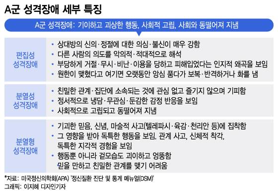 그중 'A군'은 기이하고 괴상한 행동을 하며, 사회적으로 고립돼 지내는 게 특징으로, 편집성 성격장애, 조현형(또는 분열형) 성격장애, 조현성(또는 분열성) 성격장애가 포함된다. A군의 조현성 성격장애는 대인관계나 사회활동이 매우 제한적이다. 사회적 관계에 대한 관심이 결여돼 있고, 혼자 지내려는 경향이 강하다. 내향성으로, 감정적인 냉담함이 특징이다.