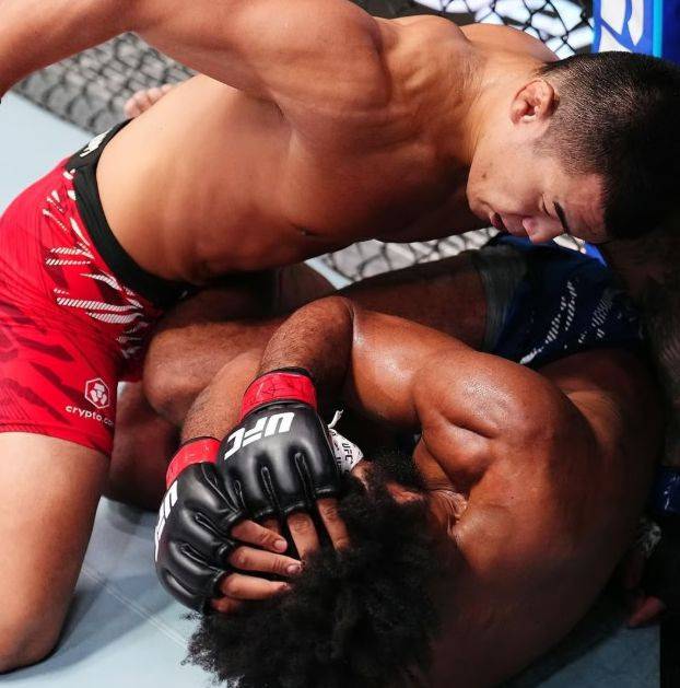 벨이 울리자 고석현은 단 한 발짝도 물러서지 않았다. 상대는 190cm 장신의 스트라이커 필 로. 긴 리치와 타격을 앞세운 선수였지만, 고석현은 낮은 스탠스로 중심을 잡고 빠르게 거리를 좁혔다. 초반부터 그는 날카로운 잽과 카운터로 리듬을 흔들었고, 곧이어 테이크다운에 성공했다. 경기 초반부터 주도권은 명확했다. 상위 포지션을 점령한 뒤 엘보와 파운딩이 쏟아졌고, 로는 자세를 바꾸며 버텨보려 했지만 고석현의 컨트롤은 한 치의 틈도 없었다. 1라운드 종료 버저가 울릴 때, 이미 경기의 흐름은 한쪽으로 완전히 기울어 있었다.