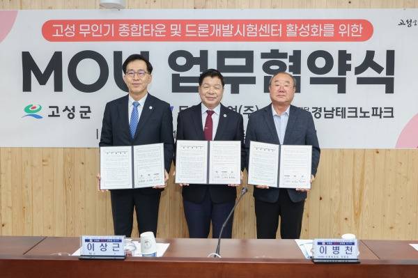경남테크노파크(원장 김정환, 이하 경남TP)는 5월 15일 경남 고성군청에서 고성군(군수 이상근), 두원중공업(대표이사 김태훈)과 무인기 종합타운 및 드론개발시험센터 활성화와 드론·미래항공모빌리티 산업생태계 조성을 위한 업무협약을 체결했다.