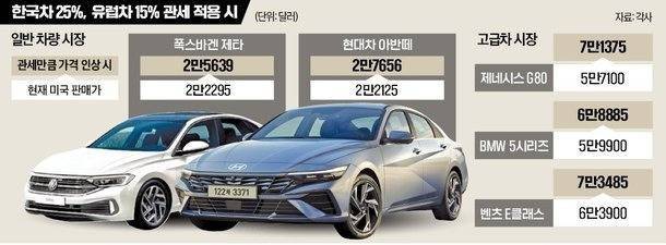 대중형 세단 시장에서도 위기는 마찬가지다. 현대차 아반떼(현지명 엘란트라)는 현재 2만2125달러로 폭스바겐 제타(2만2295달러)보다 3.9% 저렴하지만, 관세를 모두 반영하면 아반떼(2만7656달러)가 제타(2만5639달러)보다 7.7% 비싸지는 가격 역전이 발생한다.