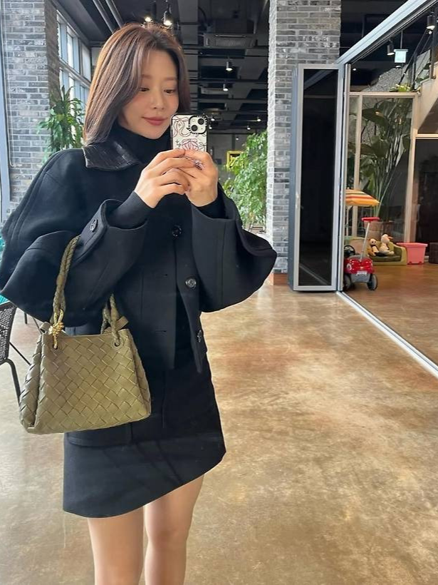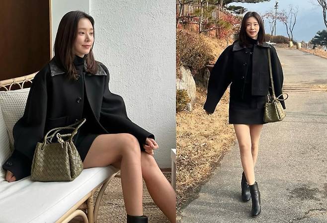 이주빈은 블랙 숏코트와 미니 스커트를 매치해 시크한 무드를 연출했습니다.
