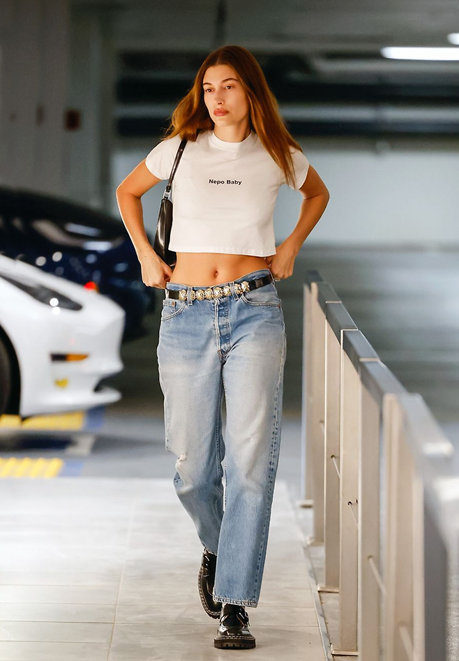 헤일리 비버는 'Nepo Baby'라고 쓰여진 화이트 베이비 티셔츠와 스터드 벨트의 로우라이즈 데님 팬츠, 여기에 블랙 로퍼를 매치해 편안한 섬머룩을 연출했다.