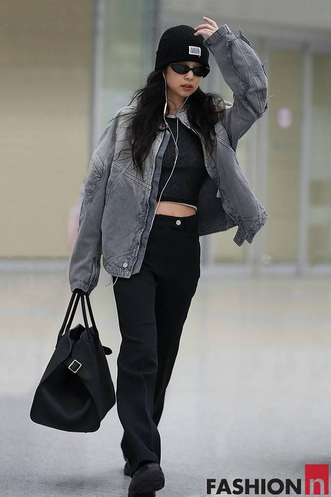 5. 블랙핑크 제니는 지난 7월 블랙 베이비 티셔츠에 빈티지 무드의 다크 그레이 데님 재킷을 걸친 걸크러시 감성의 공항패션을 선보였다.
