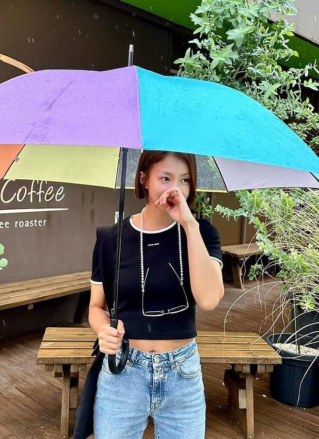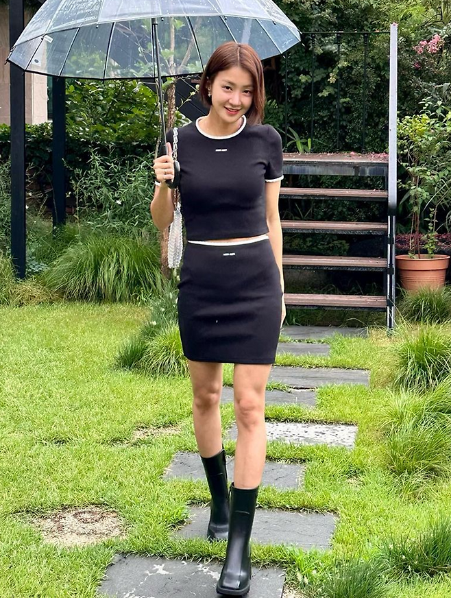 6. 이시영은 화이트 라이닝의 블랙 베이비 티셔츠와 스키니 데님 팬츠, 여기에 레인 부츠를 매치한 일상룩으로 군살없는 몸매의 각선미를 뽐냈다.