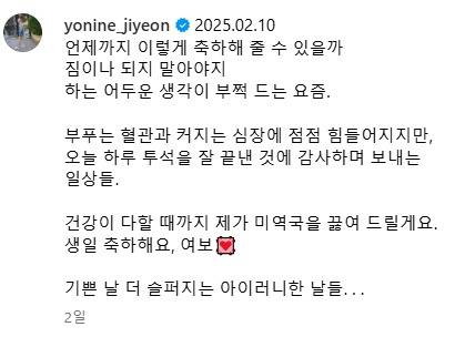 🥺 그녀는 또한 “건강이 다할 때까지 제가 미역국을 끓여 드리겠다”며 남편을 향한 애틋한 사랑을 표현했어요. 축하보다 더 큰 슬픔이 느껴지는 생일 메시지에 많은 이들이 함께 눈시울을 붉혔죠.