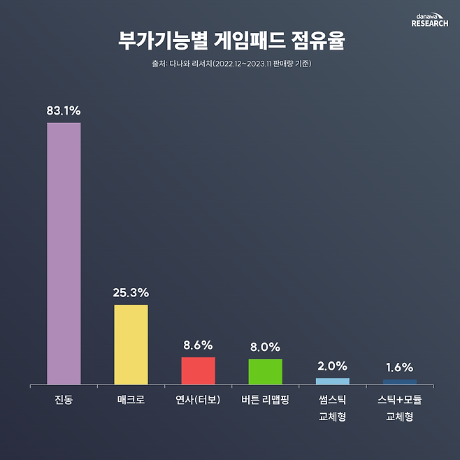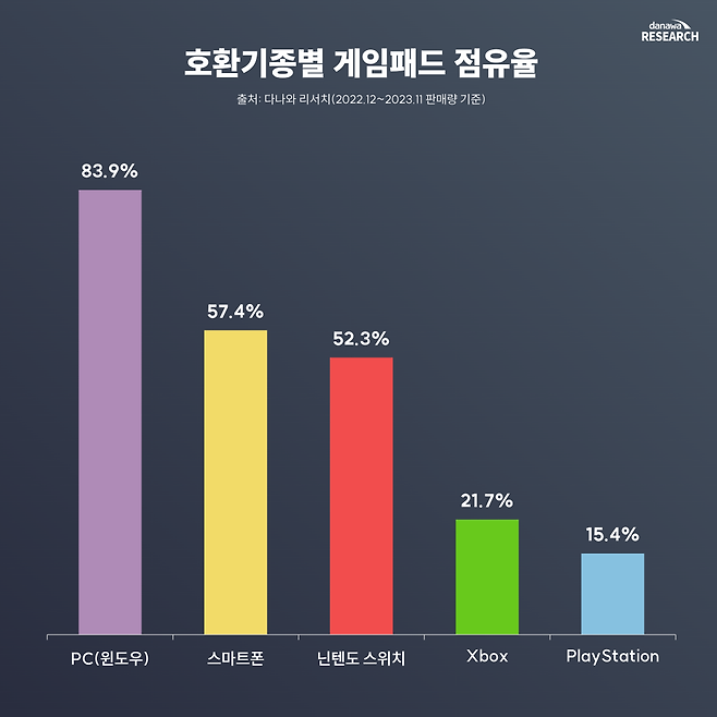 게임패드 호환기종별 점유율 순위를 보면 1위가 PC(윈도우, 83.9%)로 대부분의 제품이 PC 게이밍 환경도 기본으로 고려하고 있음을 알 수 있다. 실제로 인기 게임패드인 Microsoft XBOX Series 블루투스 무선 컨트롤러(58,700원), SIE PS5 듀얼센스(67,360원), Nintendo 닌텐도 스위치 프로 컨트롤러(66,730원) 모두 PC 연결을 지원한다.