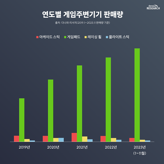 판매량을 기준으로 했을 때, 게이밍 컨트롤러 중 대장은 '게임패드'가 1위다. 다른 제품들의 판매량은 수년째 비슷한 수준을 유지하고 있는데 게임패드만큼은 예외다. 게임패드의 판매량은 그래프를 뚫을 기세로 매년 더 늘어나는 추세이며, 그 뒤를 아케이드 스틱, 레이싱 휠, 플라이트 스틱이 따르고 있다.