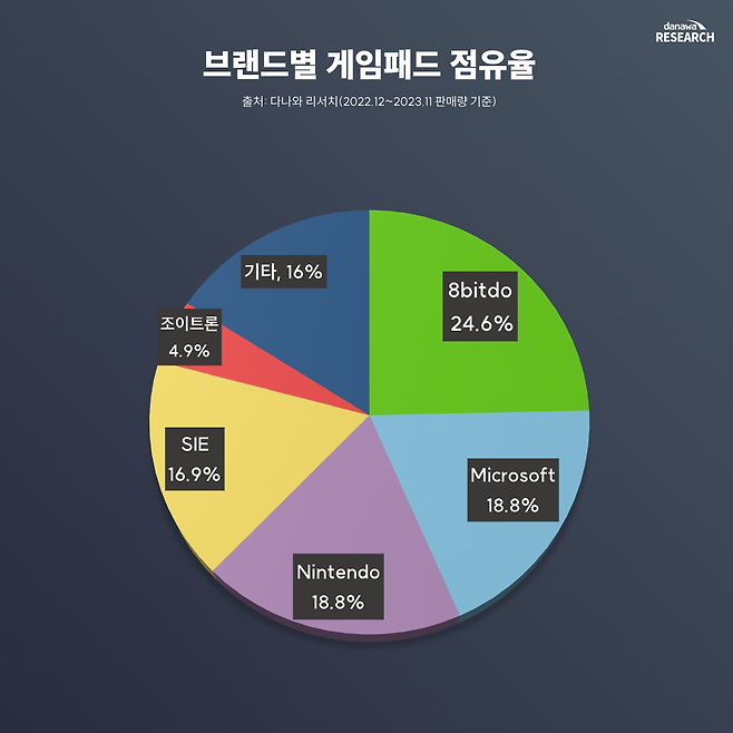 1위는 8bitDo(24.6%). 홍콩에서 태어난 게이밍 컨트롤러 전문 브랜드로 몇 년 전까지만 해도 중국산 짝퉁 패드 취급을 받았지만 지금은 전 세계 게임패드, 아케이드 스틱 시장을 호령하는 메이저 브랜드로 거듭났다. 8bitDo의 게임패드들은 거의 대부분의 플랫폼을 다 지원하는 우수한 호환성을 지녔고, 조작성과 마감도 대기업 콘솔 게임기의 게임패드에 밀리지 않는다. 가격도 합리적인 편이다.