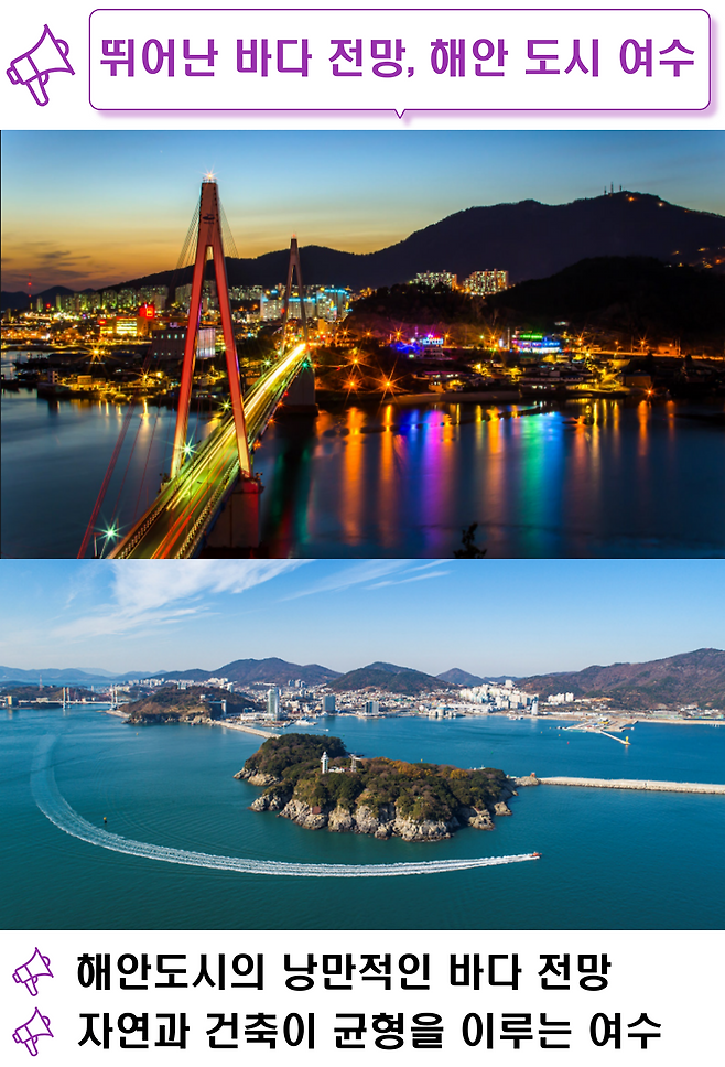 여수는 남해안의 진주라 불릴 만큼 낭만과 아름다움을 동시에 지닌 도시입니다. 낮에는 맑은 바다와 푸른 섬들이 이루는 풍경이 장관을 이루고, 밤에는 여수 밤바다를 배경으로 한 환상적인 야경이 여행객을 맞이합니다.