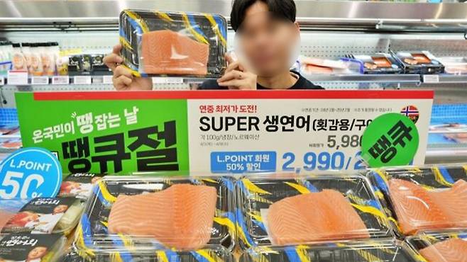대표 상품 ‘SUPER 생연어(100g·노르웨이산)’는 구이용 2750원, 횟감용 2950원으로 올해 들어 가장 저렴한 가격이다. 칠레산 ‘파타고니아 항공 직송 연어 대용량(500g)’은 1만 원대에 판매한다.