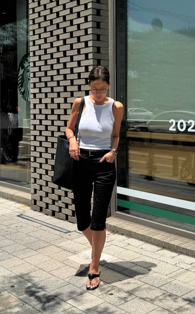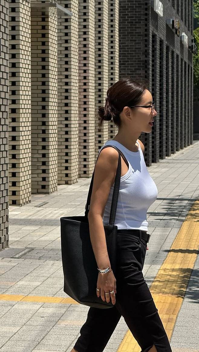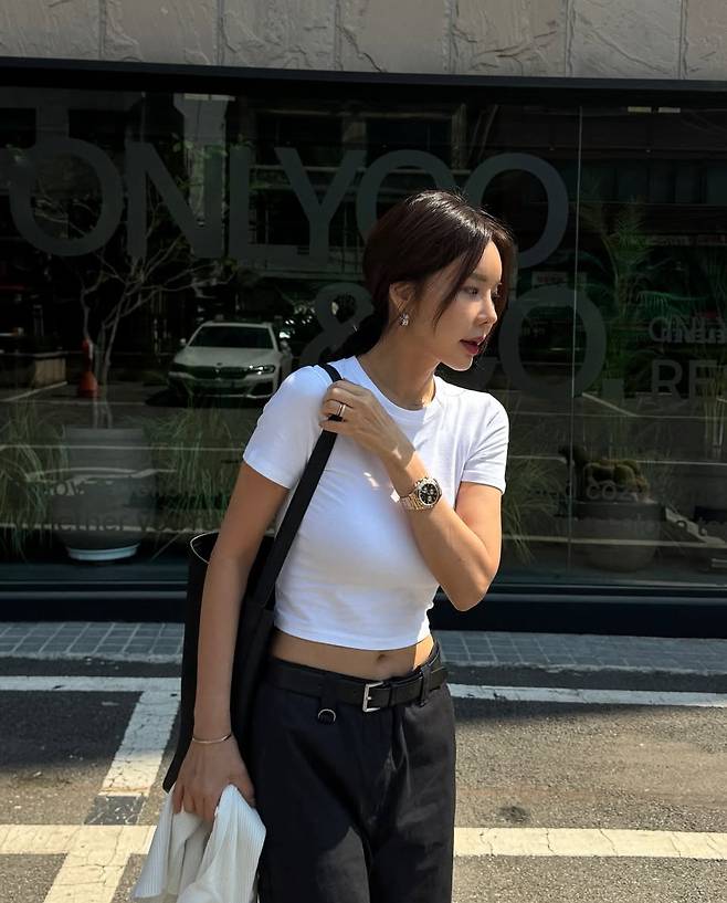 크롭 화이트 티셔츠와 하이웨이스트 블랙 팬츠를 매치해 미니멀하면서도 도회적인 캐주얼룩을 연출했습니다.