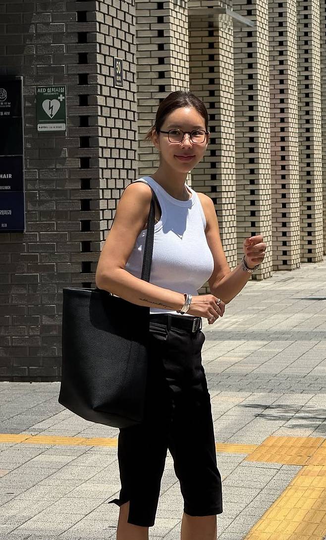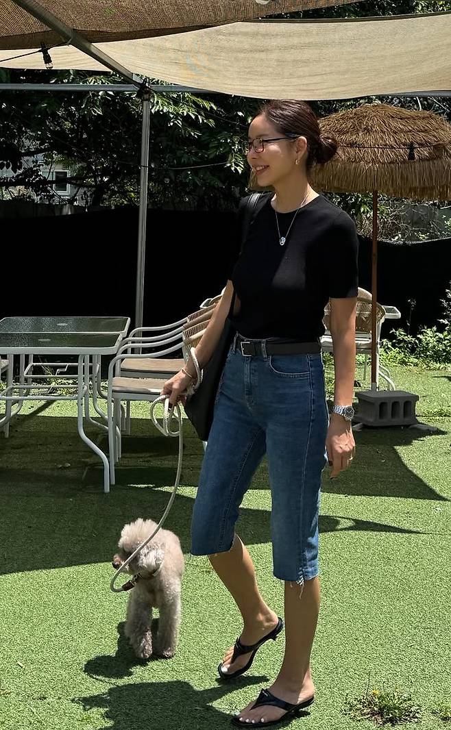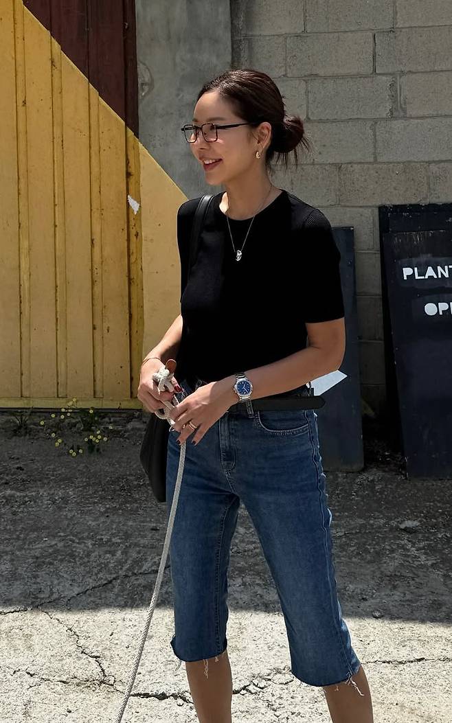 허리 라인을 강조한 실루엣으로 건강미를 부각했으며, 볼드한 워치와 심플한 이어링으로 포인트를 더했습니다.