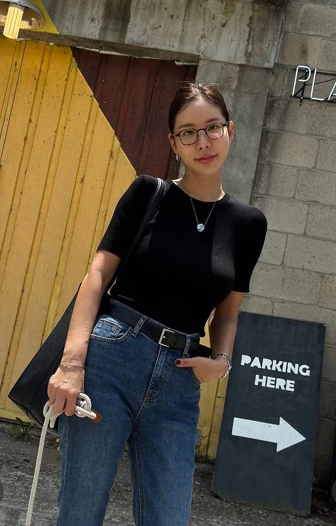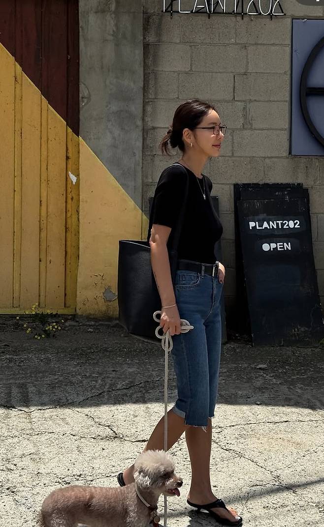 베이식한 블랙 티셔츠에 클래식한 중청 데님 팬츠를 매치해 절제된 데일리룩을 선보였습니다.
