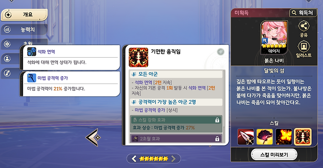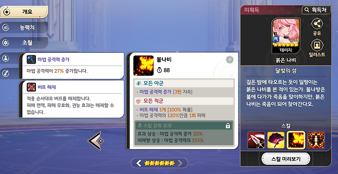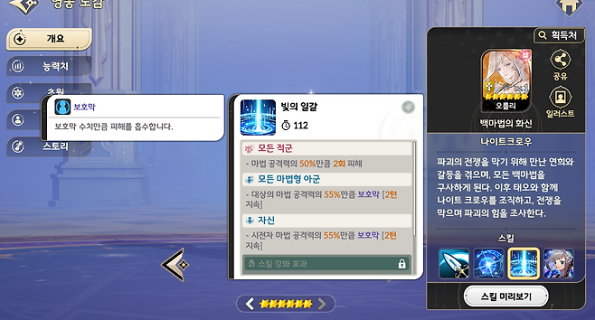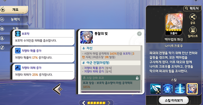 1스킬 고결한 유성은 적군 3명에게 일정 피해를 주며 2개의 버프를 해제한다. 스킬 강화 효과로는 방어력 감소 36%를 가졌다. 2스킬 빛의 일갈은 마법 공격력의 50%만큼 2회 타격을 주면서 모든 마법형 아군과 자신에게 2턴 지속되는 보호막을 제공한다. 2초월 시에는 여기에 디버프 해제 2개 혜택이 추가되어 유틸성이 강화된다. 기본 공격은 스킬 강화 시 현재 생명력이 가장 낮은 아군에게 마법 공격력 비례 회복을 제공하는 효과를 지녔다.