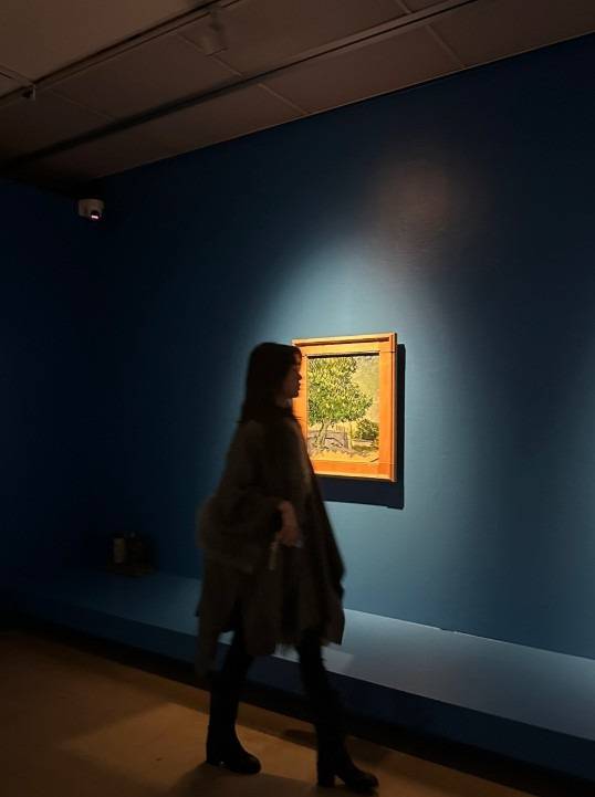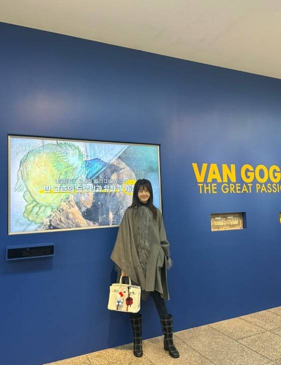 전시회와 어울리는 회색 케이프를 선택. 부담스럽지 않은 퍼가 포인트예요.