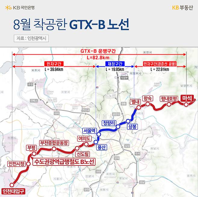 GTX-B 노선은 인천대입구역에서 남양주 마석역 82.8㎞ 구간이 지난 8월 착공에 들어갔습니다. 정거장은 모두 14곳으로 인천시청과 부평, 여의도, 서울역 등을 거쳐 남양주로 향하는 수도권 횡단 노선 중 하나입니다. 전체 공사 기간은 총 72개월로 개통은 2030년 목표입니다.