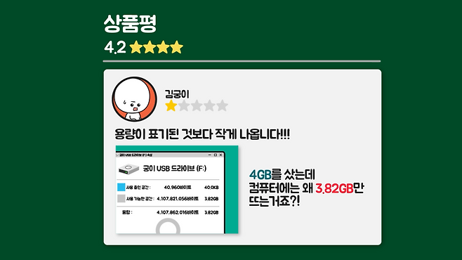그런데 이러한 장치들을 컴퓨터에 연결해서 용량을 확인해봤을 때 상품 페이지에서 봤던 용량보다 작게 표기되어 있어서 의아하지 않으셨나요?