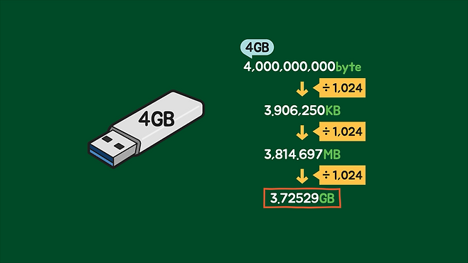 시중에서는 해당 제품을 다양한 용량으로 판매합니다. 일반적으로 4GB부터 시작해서 8GB, 16GB, 32GB 등 용량이 2배씩 증가합니다. 그런데 각 제품을 컴퓨터에 연결해보면 상품 페이지에서 봤던 용량보다 약간 작습니다. 예를 들어서 4GB의 USB 플래시 드라이브는 3.82GB라고 적혀있는 식입니다. 이유가 뭘까요?