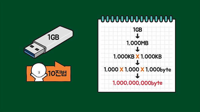 10진법으로 표기했을 때 1GB는 1,000MB이고, 1MB는 1,000KB, 1KB는 1,000byte이므로 위와 같이 구할 수 있습니다.
