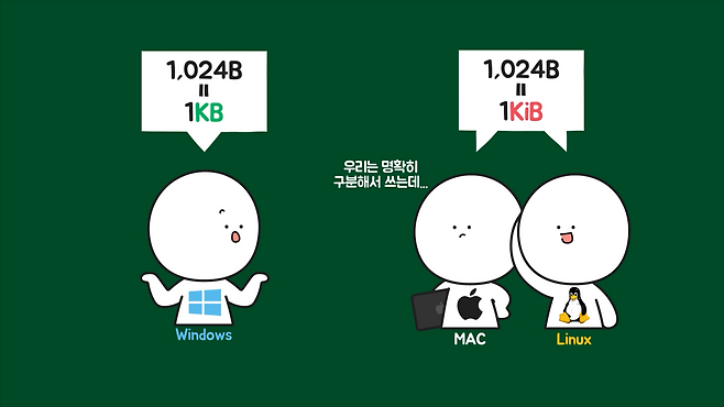 10진법일 때는 KB, MB, GB 등의 용량 단위를 사용하면 되고, 2진법일 때는 KiB, MiB, GiB 등의 용량 단위를 사용하면 됩니다. 다만, 편의상 구별 없이 KB, MB, GB 등으로 사용하는 경우가 많다 보니 이와 같은 오해가 생겼습니다.