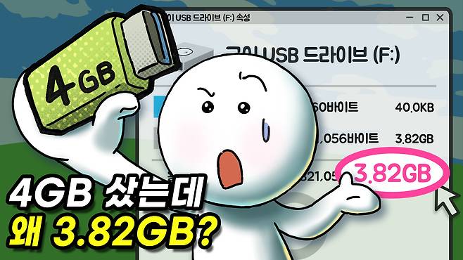 시중에서는 해당 제품을 다양한 용량으로 판매합니다. 일반적으로 4GB부터 시작해서 8GB, 16GB, 32GB 등 용량이 2배씩 증가합니다. 그런데 각 제품을 컴퓨터에 연결해보면 상품 페이지에서 봤던 용량보다 약간 작습니다. 예를 들어서 4GB의 USB 플래시 드라이브는 3.82GB라고 적혀있는 식입니다. 이유가 뭘까요?