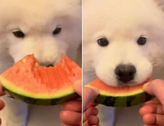 한참 동안 수박을 갉아먹던 사모예드 강아지가 입을 떼자 수박에는 녀석이 문 자국이 고스란히 남아 있었는데요.