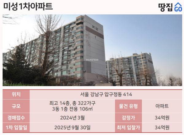 압구정정 미성1차 전용 32평, 1회차 경매서 54억에 낙찰