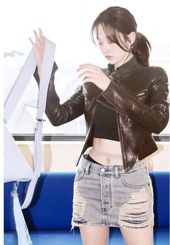 찢청과 미니 레더 재킷이라는 과감한 조합에 더해진 단 하나의 아이템이 눈을 사로잡았어요.