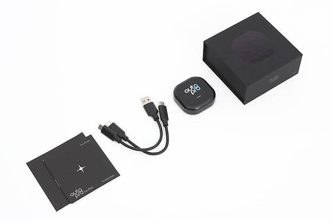 메이튼 무선 안드로이드 오토 프로 플러스는 고급스러운 무광 검정 박스에 담겨있다. 자석이 내장되어서 간편하게 열고 닫을 수 있는 박스 안쪽에는 완충재가 본체를 안전하게 감싸고 있다.