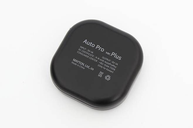 메이튼 무선 안드로이드 오토 프로 플러스는 고급스러운 무광 검정 박스에 담겨있다. 자석이 내장되어서 간편하게 열고 닫을 수 있는 박스 안쪽에는 완충재가 본체를 안전하게 감싸고 있다.
