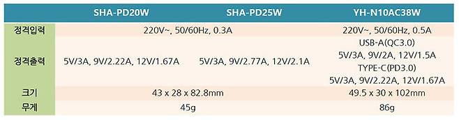 38W 모델인 YH-N10AC38W는 비슷한 디자인이지만 크기가 다르다. 49.5×30×102㎜로 20W와 25W 모델에 비하면 살짝 크지만, 마찬가지로 콤팩트한 사이즈이기 때문에 휴대에는 불편함이 없다.