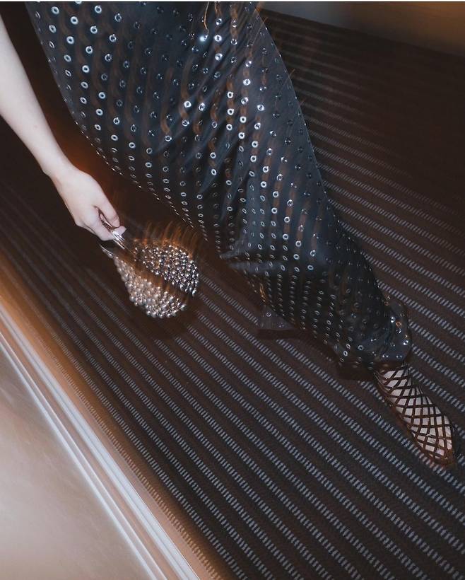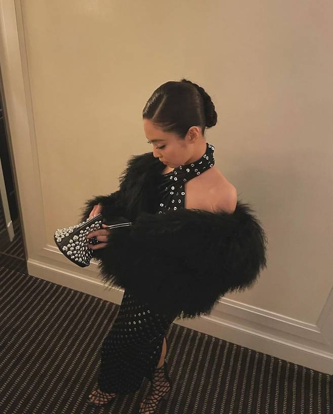 제니는 은색 펀칭이 여럿 장식된 블랙 홀터넥 드레스를 착용해 독특한 패션을 선보임과 동시에 우아한 자태를 뽐냈습니다.