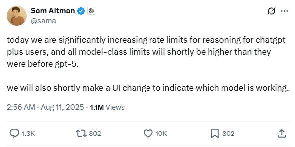 오픈AI CEO 샘 알트먼이 ChatGPT Plus 사용자들의 추론(reasoning) 모델 사용 한도를 크게 늘렸다고 12일 밝혔다. 이번 조치로 모든 모델 클래스의 한도가 GPT-5 출시 이전 수준을 넘어설 예정이며, 조만간 어떤 모델이 동작 중인지 표시하는 UI 변경도 적용된다.
