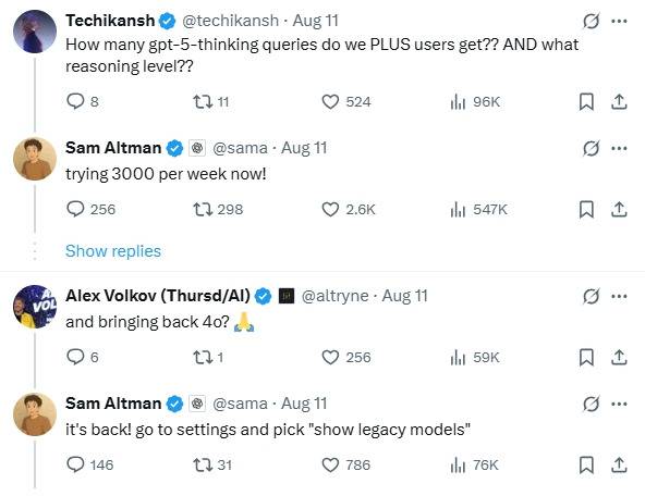 샘 알트먼의 포스팅에 X계정 'Techikansh'라는 사용자는 'gpt-5 사고방식 쿼리를 몇 개나 받나요? 그리고 추론 수준은 어떻게 되나요?'라고 질문했고 알트먼은 '지금 주당 3000회가 가능하게 시도하고 있어요!'라고 답했다.