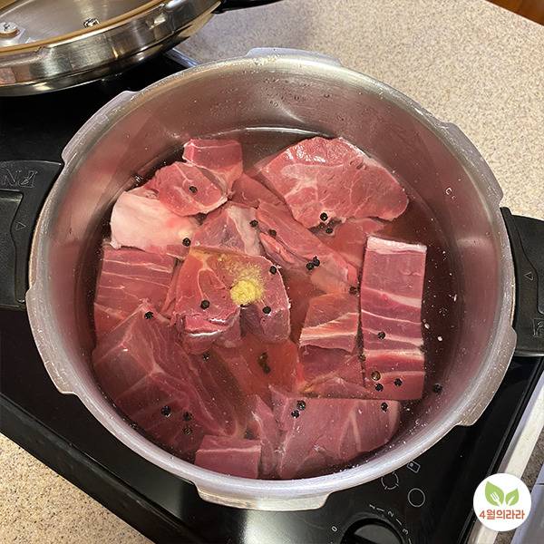 → 압력솥에 고기, 통후추, 생강, 물 1L 넣고, 강불 5분 + 약불 5분 → 불 끄고 그대로 두기
