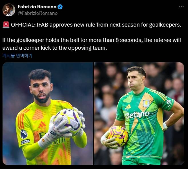 유럽 축구 소식에 정통한 파브리지오 로마노 기자는 1일(한국시간) 자신의 소셜 미디어(SNS) 계정을 통해 "다음 시즌부터 골키퍼에게 적용되는 새로운 규칙이 승인됐다. 골키퍼가 공을 잡은 후 8초 이상을 보내면 심판은 상대 팀의 코너킥을 선언한다. 이 규칙은 국제축구평의회(IFAB)를 통해 승인됐다"라고 전했다.