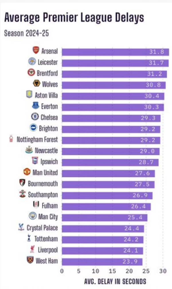 또한 축구 통계 전문 매체 '옵타'는 9월 24일 "아스널은 맨시티와의 경기에서 고의로 시간을 지연했다고 비판받고 있다. 실제로 조사 결과 그들은 PL에서 가장 많은 시간을 낭비하는 것으로 밝혀졌다"라며 아르테타 감독의 아스널은 경기 당 평균 시간 지연으로 31.8초를 소비했다고 밝혔다. 여기엔 골킥, 코너킥, 프리킥 등 빠른 경기 속행을 방해하는 여러 요소가 포함됐다.