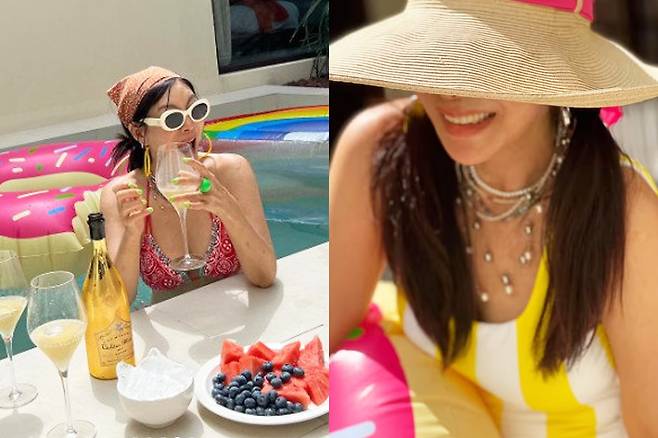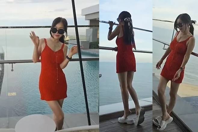 사진 속 황신혜는 상큼한 노란색 세로줄 무늬의 원피스 수영복과 화려한 빨간 비키니 등을 입고 즐거운 휴가를 만끽했다.
