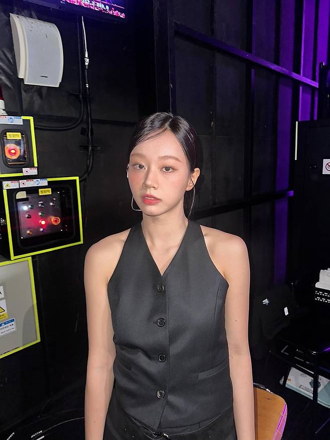 혜리가 선택한 스타일은 하이넥 슬리브리스 디자인의 시퀸 크롭탑으로, 은은한 라벤더 컬러가 고급스럽게 반짝이며 조명 아래서 더욱 화려한 존재감을 드러냈다. 몸에 밀착되는 실루엣 덕분에 군살 없이 깔끔한 라인을 강조했고, 블랙 하의와의 대비로 상체에 시선을 집중시키는 연출이 돋보였다. 여기에 화려한 드롭 이어링으로 포인트를 더해 무대 뒤에서도 스타다운 아우라를 완성했다.