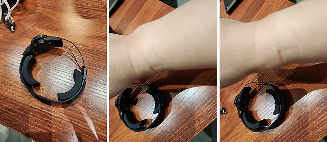 이전 두 모델인 Medical과 Advanced 피코 밴드에 이어 새로운 세 번째 Fit 모델은 두 개 중간 사이즈처럼 느껴집니다. 마이크로 단위로 조일 수 있는 위 다이얼 부분은 Advanced 모델처럼 얇고 금색이 없이 보다 깔끔해 보입니다. 디자인 차원에서 가장 달라진 점은 손목을 감싸는 부분은 더 두툼해지고 위치를 조절할 수 있습니다. 사이즈는 약간 더 커졌으나, 손목의 기둥 뼈를 잡아주는 패드들은 더 효율적으로 손목을 고정시켜 줍니다.