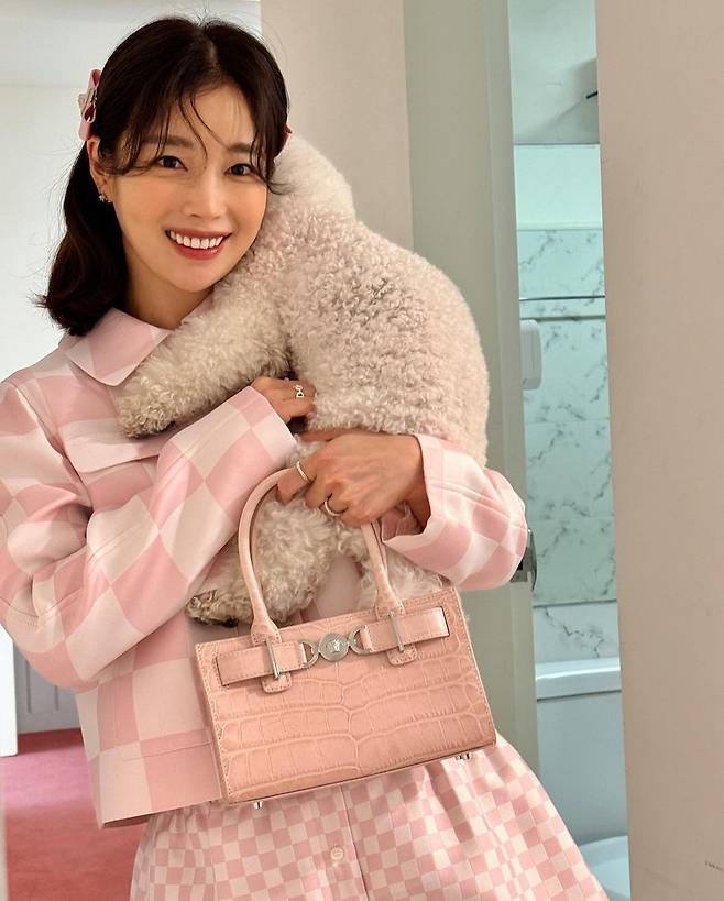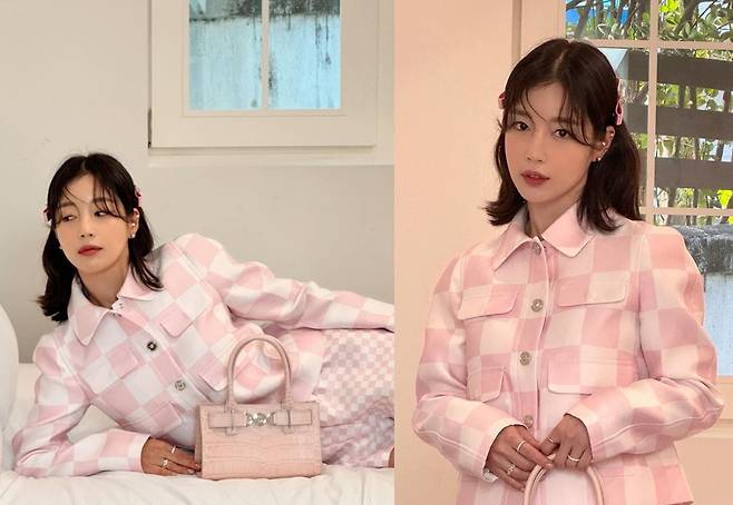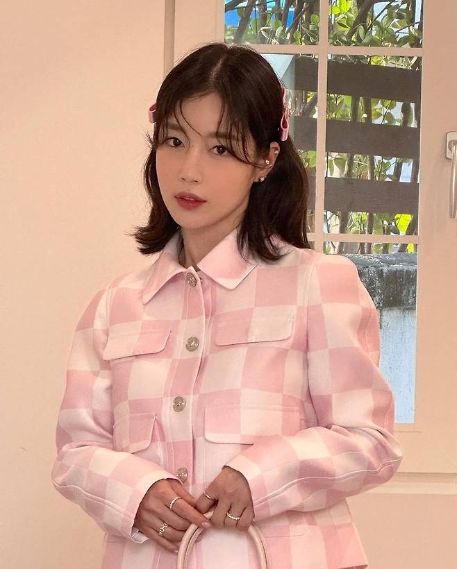 기은세는 부드러운 핑크색 체크 패턴의 재킷을 착용해 세련되고 사랑스러운 매력을 발산했습니다.
