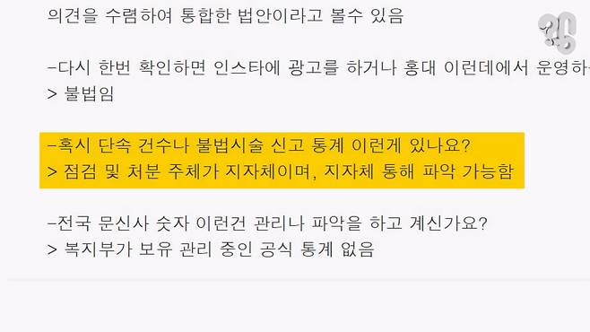 복지부와 지자체 모두 단속을 하지 않고 있다는 거다. 불법이라고 인정하면서 단속을 안 한다니 좀 혼란스러운데, 서울시에선 시 자체보다 각 자치구 보건소에서 단속을 하는 것으로 안다고 설명했다. 왠지 계속 뻉뺑이를 돌리는 느낌.